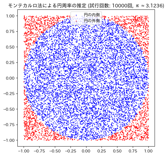 # 出力結果 試行回数: 10000回 円周率の推定値: 3.1236