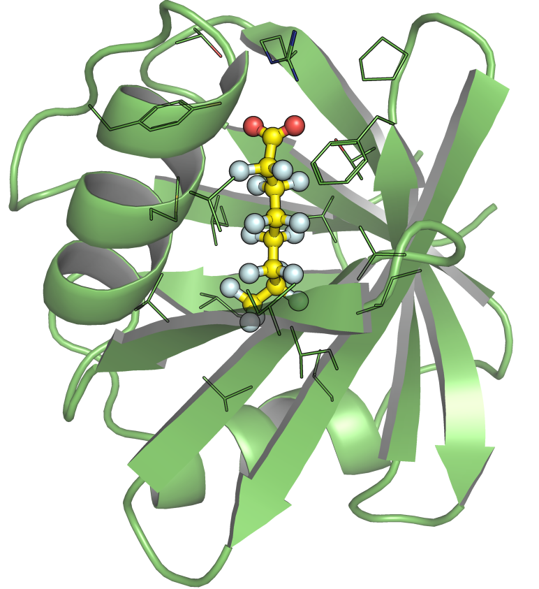 βシートがバレルようになりつつ、αヘリックスと合わせ技でPFOAを包んでいるような形になっています。有機フッ素と直接接触する部位には疎水性アミノ酸側鎖が配置されています。また、PFOAのカルボキシル基は分子表面に露出するような形となり、それをアルギニン側鎖が抑えているようにみえます。