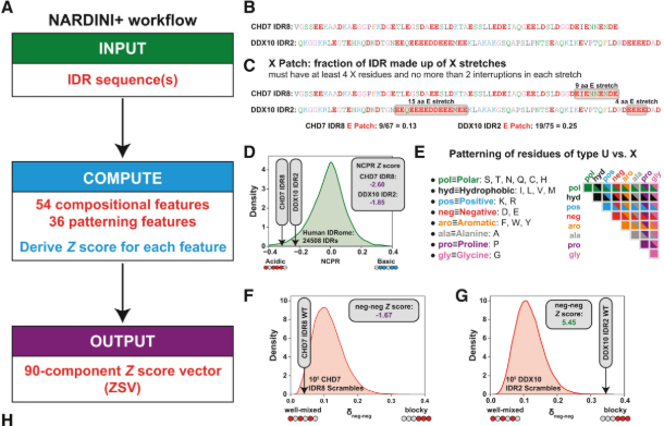 IDRの特徴を数値化するために NARDINI+ というアルゴリズムが提唱されています。これは、アミノ酸組成(54次元)と、配列のパターニング(36次元)を組み合わせた90次元のベクトル(Zスコアベクトル)としてIDRを表現する手法です。