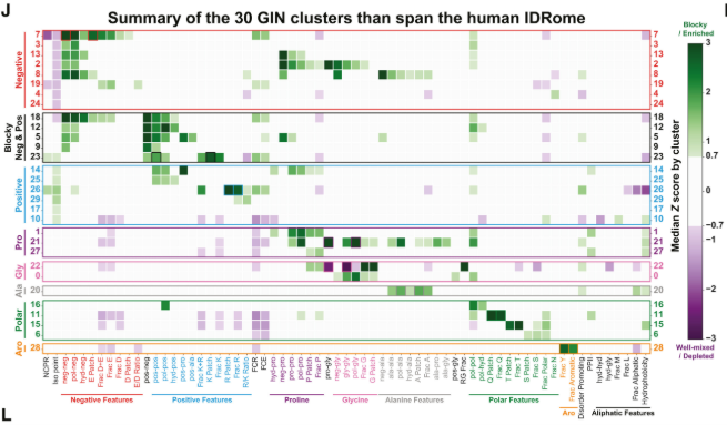得られたZスコアベクトルを用いて、著者らはK-means法によるクラスタリングを行いました。その結果、ヒトのIDRは30個の離散的なグループ(GINクラスター)に分類できることが分かりました。これは言わば、IDRの「周期表」のようなものです。
