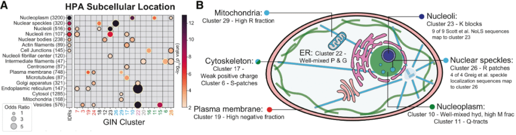 今回紹介するRuffらの研究(Washington University in St. Louis)は、この分子グラマーを定量化するアルゴリズム 「NARDINI+」 を開発し、ヒトプロテオーム内の24,508個のIDRを解析しました。その結果、IDRは30種類のクラスター(GINクラスター)に分類でき、それぞれのクラスターが細胞内の「住所(核小体や核スペックルなど)」や「機能」をコードしていることを明らかにしました。