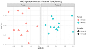 Site(Location)のグループごと、つまり、ForestAとForestBに分けた形でNMDS図を表示して、Period(Time)グループについてみてみます。